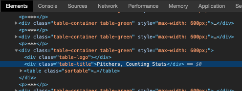 As I mentioned above, Baseball Reference has dynamic content, so parts of the page (including the table I want data from) only display once I scroll to them. This means that the page source code is different depending on how I interact with the page, and if I scrape the page before I scroll to the table, I’m not going to find the code for the table in the scraped source code.